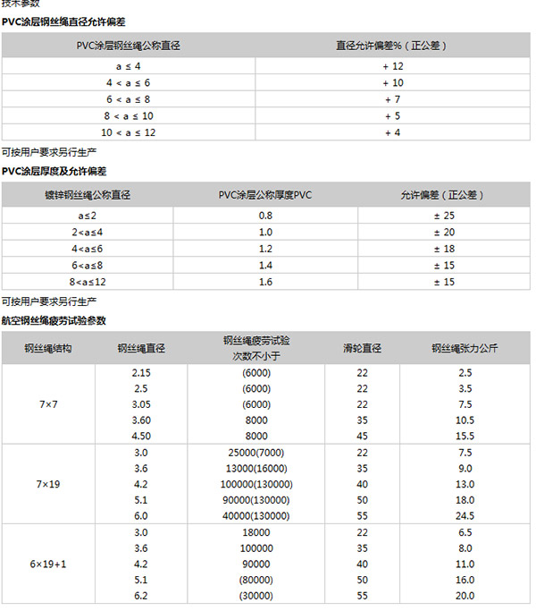 ·航空钢丝绳是用于大型客机及运输机的操作和控制系统的重要元件,为了提高在使用上的安全性,必须较一般普通钢丝绳的性能有更高的要求。如抗拉强度要达到190公斤/毫米2以上,并且每根钢丝绳根据其结构和规格不同,在不同的张力下进行疲劳试验(如表)